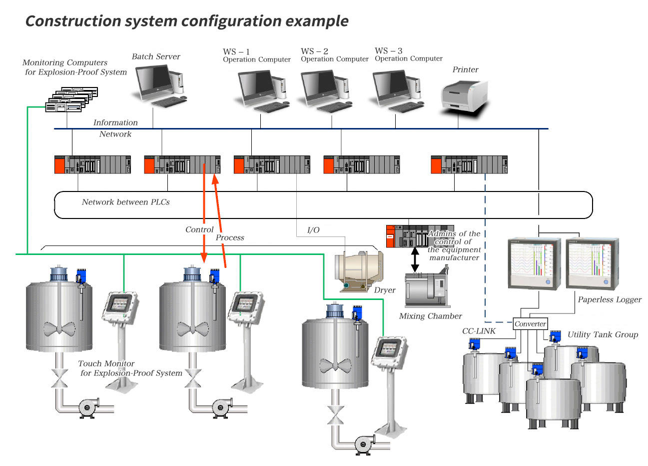 We also offer process control for batch plants. We provide equipment control for factory automation, monitoring software with a user-friendly interface, highly secure and maintainable database and server systems, all of which are highly networked in order to meet our customers’ requirements.
